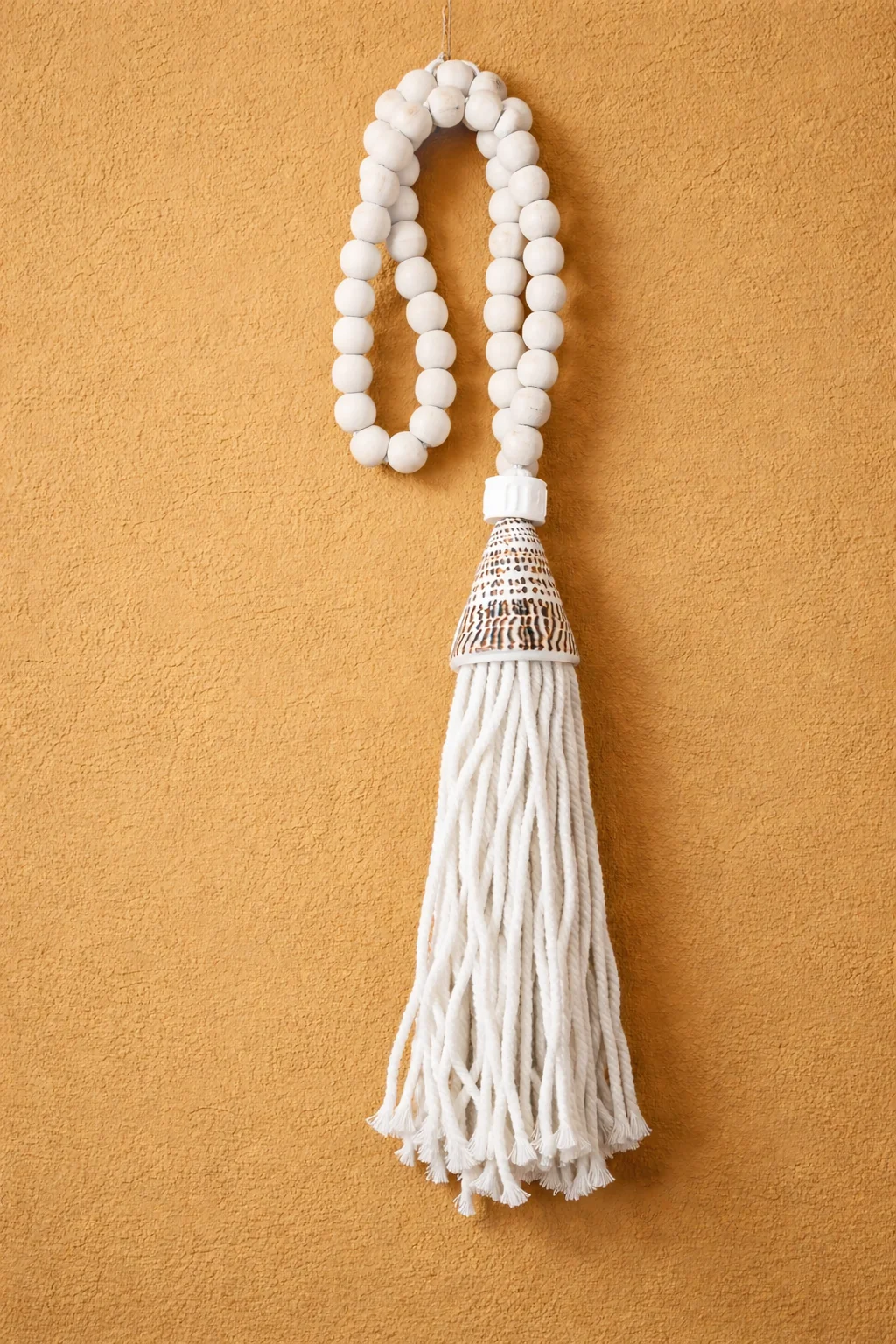 Suspension en perles en bois blanche et gros coquillage tigre avec de la laine.