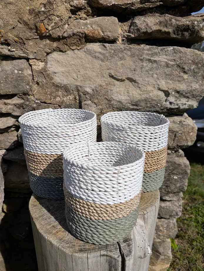 - Matière : tressée, fait main (corde ou papier torsadé)