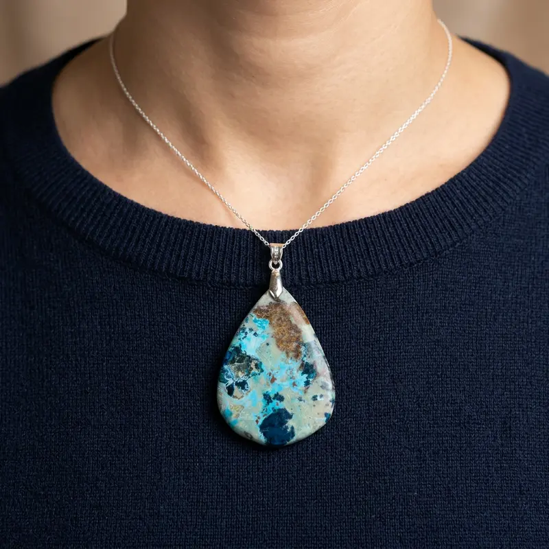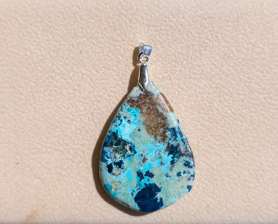 - Pierre : Shattuckite naturelle polie, aux motifs marbrés uniques (nuances de bleu, turquoise, marron, beige).